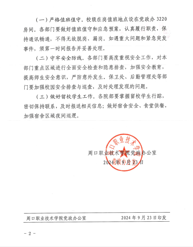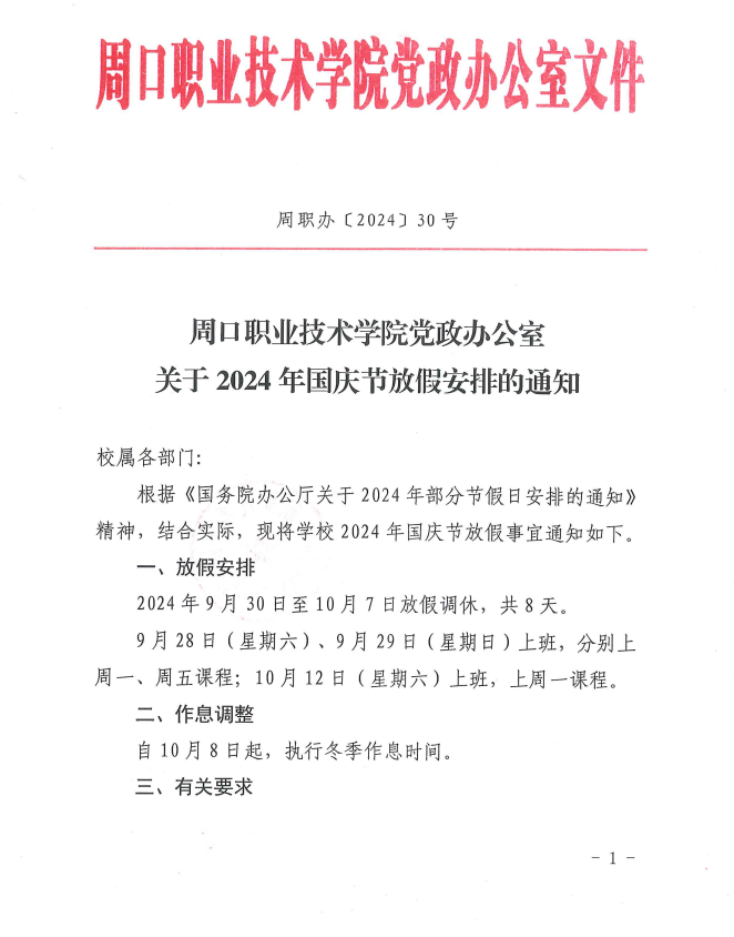 伟德体育党政办公室关于2024年国庆节放假安排的通知