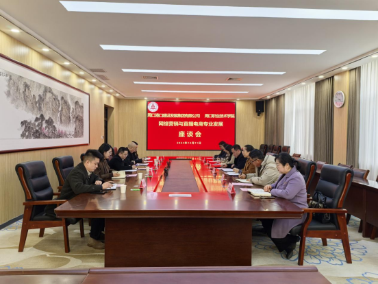 座谈会上,陈鹏书记对企业代表的到来表示欢迎,并强调此次座谈会在高职院校新双高建设背景下会发挥重要的作用。院长袁向华对网络营销与直播电商专业作详细介绍,总经理助理姚立逵对我校网络营销与直播电商专业的发展给予了充分肯定。随后,双方就网络营销与直播电商领域的行业发展趋势、潜在合作机会等进行交流,探讨了如何整合双方资源,在人才培养、实践基地建设、项目建设等方面开展更广泛深入的合作。袁院长表示在国家职教政策大力提倡产教融合、校企合作的背景下,将企业搬到学校,把课堂设在车间、直播间,为社会输送高质量人才,服务区域经济发展,离不开地方企业的大力支持。姚总表示愿与我院“共商、共建、共享”,为我院网络营销与直播电商专业学生提供实习就业岗位,为与我院开启产教融合、校企合作打下基础。