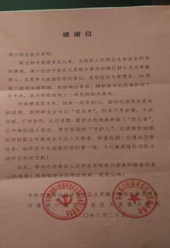 2020年3月20日,周口市经济开发区太昊路办事处为伟德体育送上感谢信,感谢伟德体育培养出如此优秀的学生,并赞扬了康明辉不畏疫情,不讲条件,主动请缨,勇做家园“守护人”,舍小家为大家的担当精神。