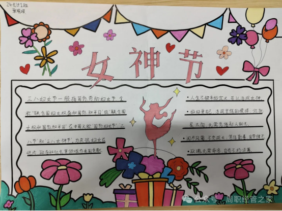 此次手抄报活动不仅为同学们提供了展示自我、表达情感的平台,也进一步提升了同学们的性别平等意识,营造了‘尊重女性、关爱女性’的良好校园氛围。