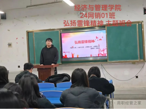 为传承和弘扬雷锋精神,增强同学们的奉献意识,经济与管理学院于2025年3月13日以班级为单位开展了“学习雷锋精神”主题班会。本次班会由各班辅导员主讲,全体学生参加。