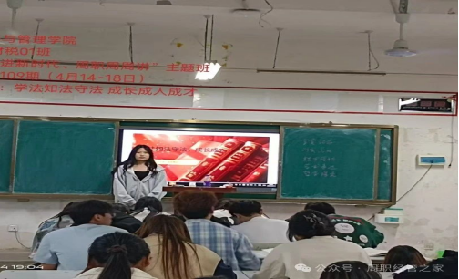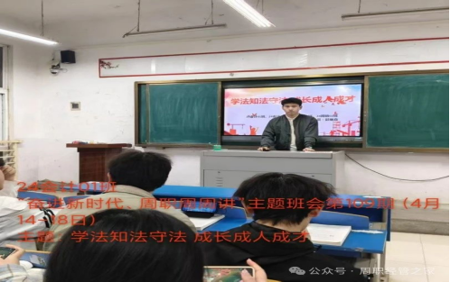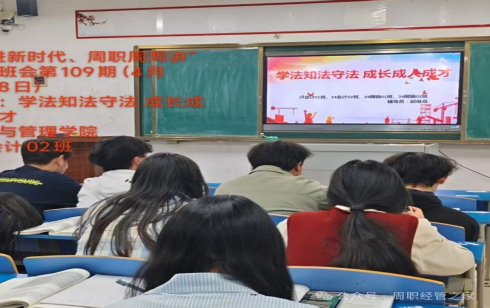 为深入贯彻落实法治教育要求,增强师生法治观念,营造校园法治文化氛围,伟德体育经济与管理学院于4月15日组织开展了第109期"奋进新时代、周职周周讲"主题班会活动,围绕"学法知法守法 成长成人成才"主题开展系列教育活动。