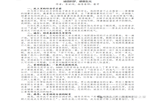 评委们秉持认真负责的态度,对每一篇稿件进行了仔细阅读和深入分析。在初步筛选出较为优秀的作品后,评委们又进行了多轮讨论和对比,最终确定了各个奖项的归属。本次征文活动共评选出一等奖:胡梦源,吉泫润,郑莹莹;二等奖:朱悦,吴凤阳,王心如;三等奖:张玉莹,刁新苗,张春雨欣,马田慧。获奖作品质量上乘,内容丰富。有的讲述了学生受助后克服困难、努力学习的故事,展现了自立自强的精神;有的表达了对国家资助政策的感恩之情,弘扬了诚信感恩的价值观。这些作品紧扣“守诚信之本,怀感恩之心”的主题,具有较强的思想引领力和情感号召力。