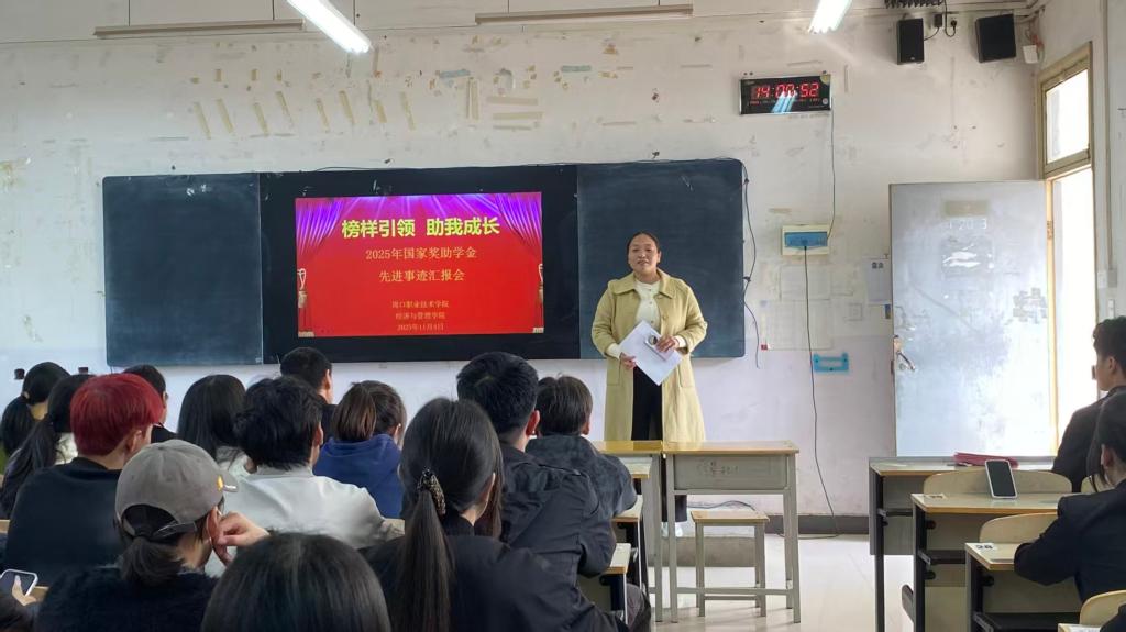 为发挥国奖学生榜样作用、营造优良校园氛围,2025年11月5日经济与管理学院在4203教室举办国家奖学金先进事迹汇报会。汇报会由雷芹老师主持,23级国奖获得者胡梦圆、单趁鑫、刘莹同学为24、25级学生代表分享了获奖心得。